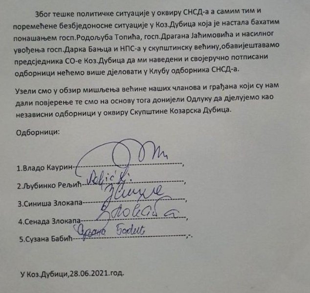 Zanimljivo, dopis je u Opštinu Kozarska Dubica došao isti dan, odnosno juče, 28.juna, kada su petoro odbornika javno obznanili svoje nezadovoljstvo i istupanje iz SNSD-a.