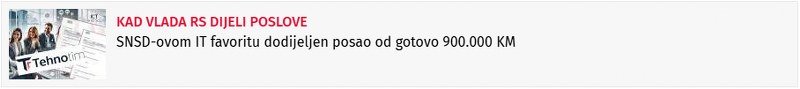 Ogledni primjer je „Tehnotim“, nasljednik „Prointera“, nekadašnjeg IT tender giganta povezanog sa organizacionim sekretarom vladajućeg i očevog SNSD-a Igorom Dodikom. Nekoliko mjeseci pred izbore Narodna skupština RS razmatra povećanje plata zaposlenima u javnom sektoru i socijalni mir kupuje novim kreditima. Istovremeno, IT firma u kojoj su, prema izvorima Žurnala, mahom kadrovi „Prointera“, za samo 27 dana dobija poslove vrijedne 1.927.141 KM sa porezom.