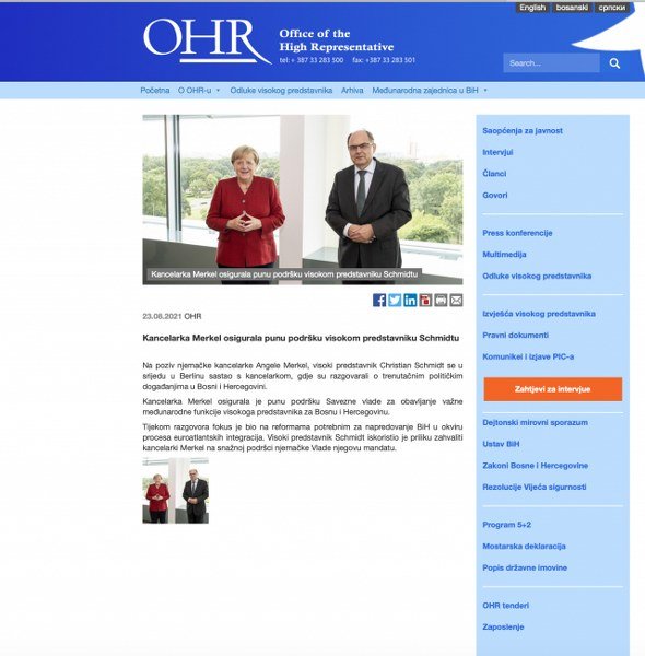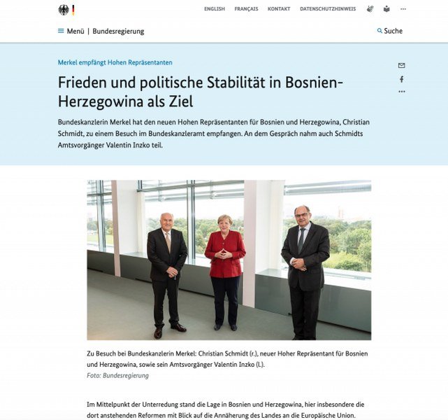 “Na poziv njemačke kancelarke Angele Merkel, visoki predstavnik Christian Schmidt se u srijedu u Berlinu sastao s kancelarkom, gdje su razgovarali o trenutačnim političkim događanjima u Bosni i Hercegovini.Kancelarka Merkel osigurala je punu podršku Savezne vlade za obavljanje važne međunarodne funkcije visokoga predstavnika za Bosnu i Hercegovinu.Tijekom razgovora fokus je bio na reformama potrebnim za napredovanje BiH u okviru procesa euroatlantskih integracija. Visoki predstavnik Schmidt iskoristio je priliku zahvaliti kancelarki Merkel na snažnoj podršci njemačke Vlade njegovu mandatu”, glasilo je saopćenje za javnost OHR-a.