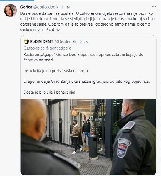U međuvremenu na twiteru oglasila se i Gorica Dodik tvrdeći da nije bilo kršanja propisanih mjera mjera, te da su na spornom dijelu otvorene šajbe, ali to kako iz inspekcije tvrde nije tačno.