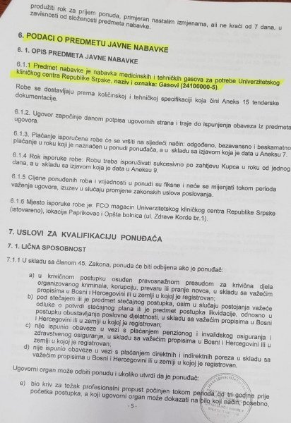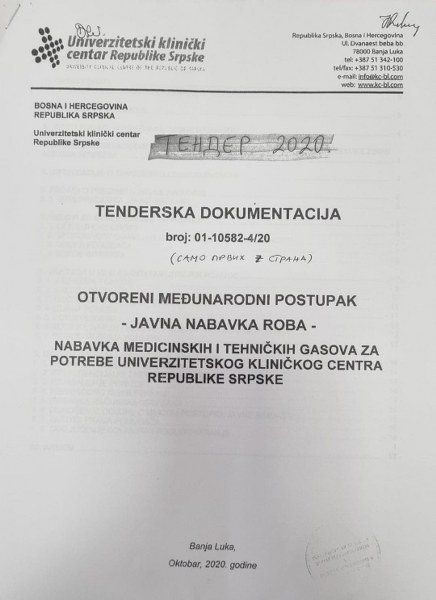 Ta tenderska dokumentacija broj 01-10582-4/20 iz oktobra 2020. godine na osnovu koje je UKC RS proveo nabavku medicinskog i tehničkog gasa nije pripremljena u skladu sa Zakonom o javnim nabavkama BiH i Uputstvom za pripremu modela tenderske dokumentacije i ponuda.
