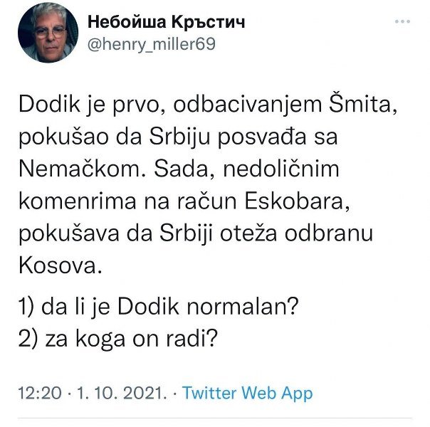 Beogradski marketinški stručnjak i analitičar Nebojša Krstić na tviter nalogu postavio je pitanje: Da li je Dodik normalan i za koga radi?