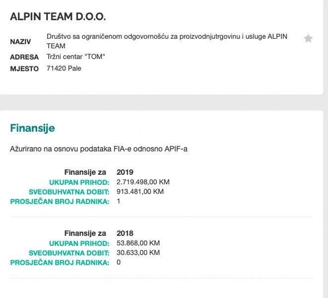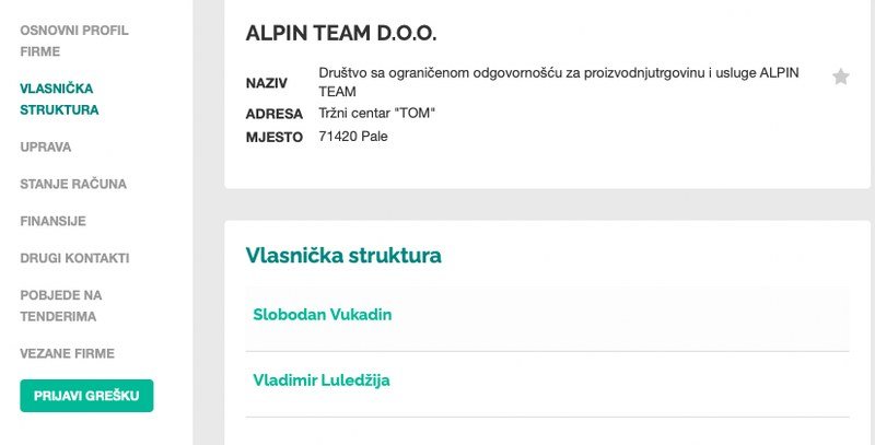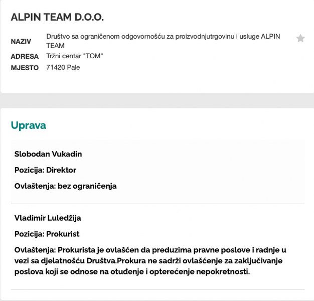 5. Prema zvaničnim podacima sa portala Akta.ba osnivači “Alpin team” su Vladimir Luledžija i Slobodan Vukadin.