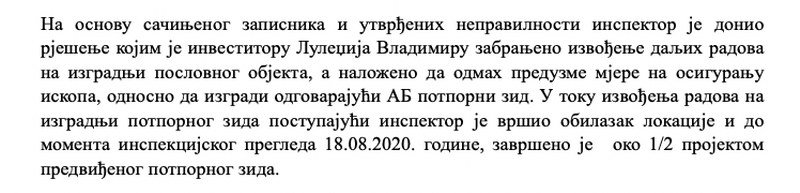 3. Republički inspektorat je saopštio da na pomenutom placu gradi firma “Alpin team” d.o.o. Pale, koja je investitor, a Luledžija odgovorno lice.