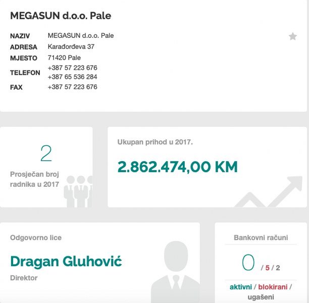 2014. godina: Prihod 10.256.448 KM; Rashod 6.710.087 KM; Sveobuhvatna dobit 3.191.725 KM; Broj zaposlenih radnika Dva, koji su očito “Supermeni”.