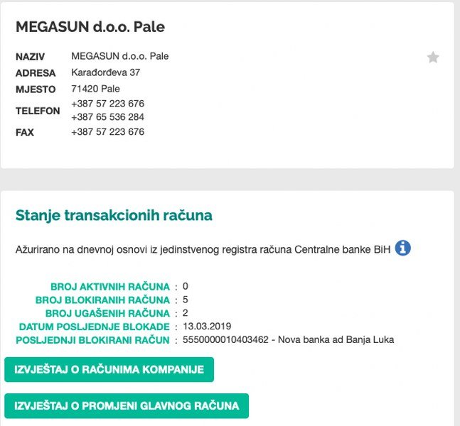11. Nije to uopšte čudno, ako se sagledaju dometi sa firmom “Megasun” d.o.o. Pale, čiji je osnivač, i koja je imala prosječno zaposlena čak dva radnika. “Megasun”-u je trenutno blokirano čak pet računa, iako je preko ove Luledžijine firme oprano desetine miliona KM i djelovala je baš uspješno.