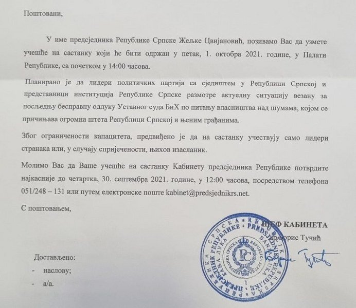 Željka poziva lidere na sastanak u petak, dan uoči protesta. Šef Kabineta predsjednice Republike Srpske Republike Srpske, bivši ministar komunikacija u Savjetu ministara BiH Boris Tučić, uputio je u ime predsjednice Srpske danas poziv liderima svih parlamentarnih stranaka, koje imaju sjedište u Republici Srpskoj, na sastanak u petak u Palati Republike u Banjaluci od 14 časova. Tema je poslednja Odluka Ustavnog suda BiH na izmejne Zakona o Šumama Srpske, i Posebna sjednica Narodne skupštine Republike Srpske koja se najavljuje.