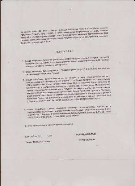 Na zatvorenoj sjednici Vlade RS, održanoj 2.9.2010. godine, data je saglasnost da privatna firma European Green Projects (registrovana u Brčkom) može na berzi trgovati vazduhom Republike Srpske; preciznije pravima za emisiju ugljendioksida (CO2) na evropskoj berzi.