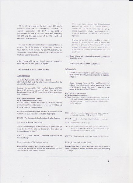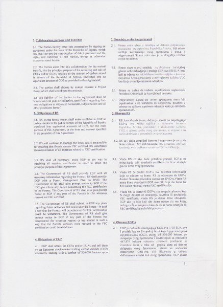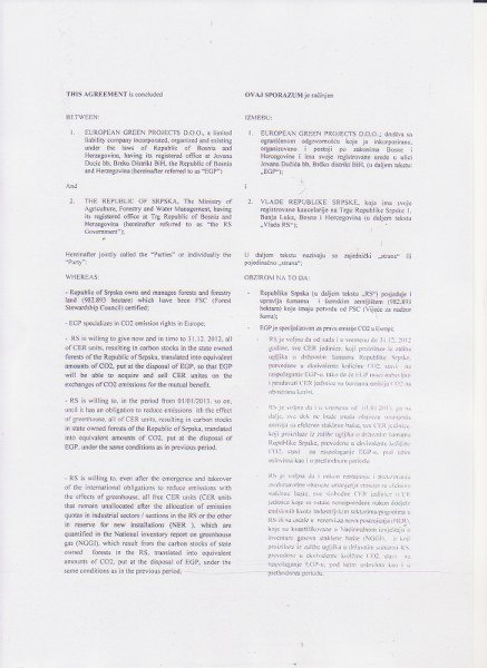 „EGP je dužna da obezbjeđuje CER-ove i/ili EUA-ove i prodaje iste na Evropskoj berzi koja trguje emisijama ugljendioksida (CO2), počev od 300.000 hektara po sklapanju ovog Sporazuma i završavajući sa preostalih 447.879 hektara, odnosno stvarnom površinom iz inventure šuma u roku od godinu dana od datuma sklapanja ovog Sporazuma“, navodi se u članu 4.1. Sporazuma o saradnji na sertifikaciji ugljendioksida uskladištenog u šumama Republike Srpske.