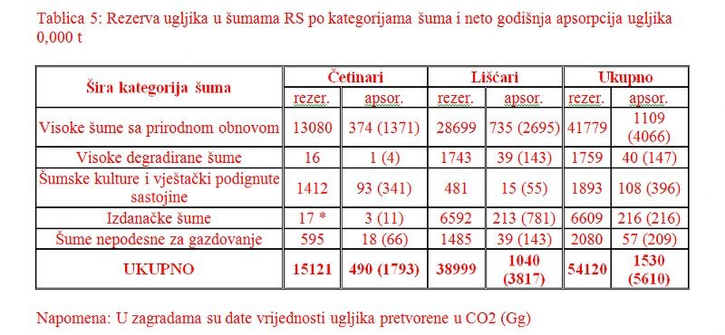 Na sajtu Saveza inžinjera šumarstva nije naznačen izvor podataka u tabeli- Rezerva ugljika u šumama RS po kategorijama šuma i neto godišnja apsorpcija ugljika 0,000 t -, a riječ je o podacima II Inventure šuma na velikim površinama u BiH, koja još uvijek nije nigdje objavljena, a davnih dana je završena (rađena je od 2006.-2009. godine).