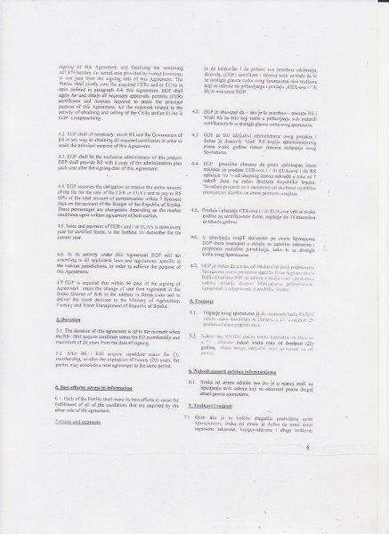 „EGP preuzima obavezu da primi cjelokupan iznos naknade za prodate CER-ove i/ili EUA-ove i da RS uplaćuje 60% od ukupnog iznosa naknade u roku od sedam radnih dana na račun budžeta RS“, navodi se u članu 4.4. Sporazuma.