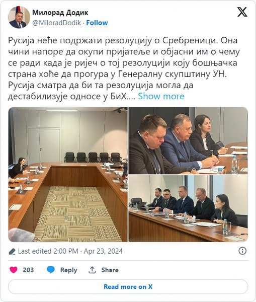 Predsjednik Republike Srpske Milorad Dodik oglasio se na društvenoj mreži "X" i rekao je da srpski narod nikada neće pristati na narativ političkog Sarajeva i dijela međunarodne zajednice o navodnom genocidu u Srebrenici.