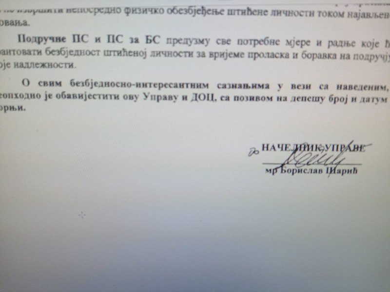 „Nalažem da PU Banja Luka, Gradiška, Doboj, Bijeljina, Zvornik i Istočno Sarajevo obezbijede nesmetano kretanje i boravak štićene ličnosti na svom području, te da izvrše fizičko, operativno i saobraćajno obezbjeđenje trase kretanja“, navodi se u Šarićevom dopisu.