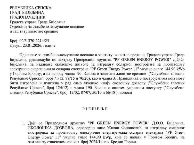 Kompanija „PF green energy power“ posluje od maja prošle godine. Trenutni direktor je Živan Filipović, a među osnivačima i vlasnicima firme se, na specijalizovanom sajtu AKTA, navodi i Mišo Partalo, dugogodišnji šef obezbjeđenja bivšeg predsjednika Republike Srpske Milorada Dodika. Inače, ta kompanija je 23. januara ove godine dobila ekološku dozvolu za izgradnju solarnog postrojenja za proizvodnju električne energije- mala solarna elektrana u Gornjem Brodcu.