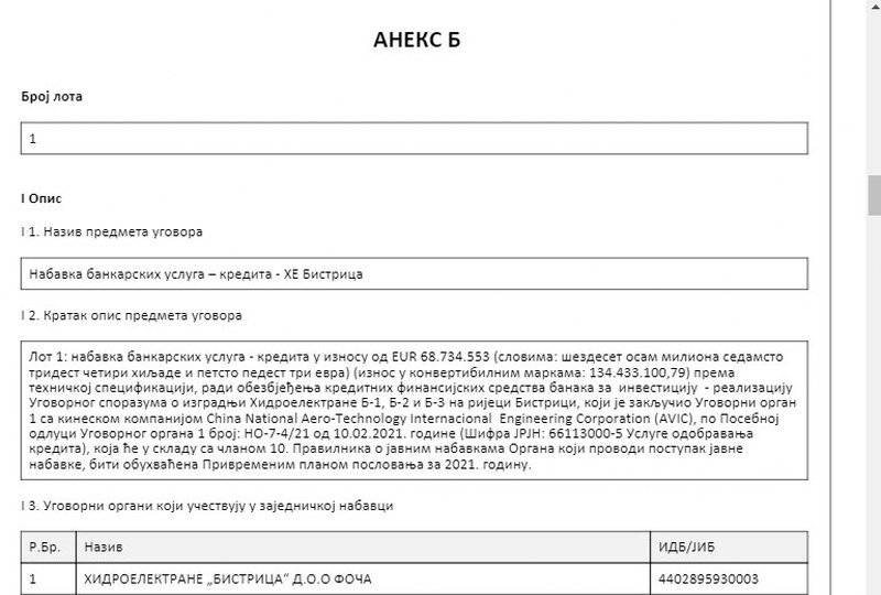 U prvom Lotu traži se nabavka bankarskih usluga – kredita u iznosu od EUR 68.734.553 (iznos u konvertibilnim markama: 134.433.100,79), radi obezbjeđenja kreditnih finansijskih sredstva banaka za investiciju – realizaciju Ugovornog sporazuma o izgradnji Hidroelektrane B-1, B-2 i B-3 na rijeci Bistrici, koji je zaključio Ugovorni organ 1sa kineskom kompanijom China National Aero-Technology Internacional Engineering Corporation (AVIC), po Posebnoj odluci Ugovornog organa 1 broj: NO-7-4/21 od 10.02.2021. godine.