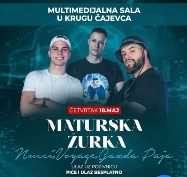 Tako je za 18. maj u multimedijalnoj sali SNSD-a u Čajavecu najavljen koncert povodom maturske žurke. Ulaz uz pozivnicu i piće su besplatni a maturante će da “zabavlja” nekoliko izvođača aktuelne muzike sumnjivog kvaliteta koji u tekstovima pozivaju na nasilje, alkoholizam, narkomaniju….