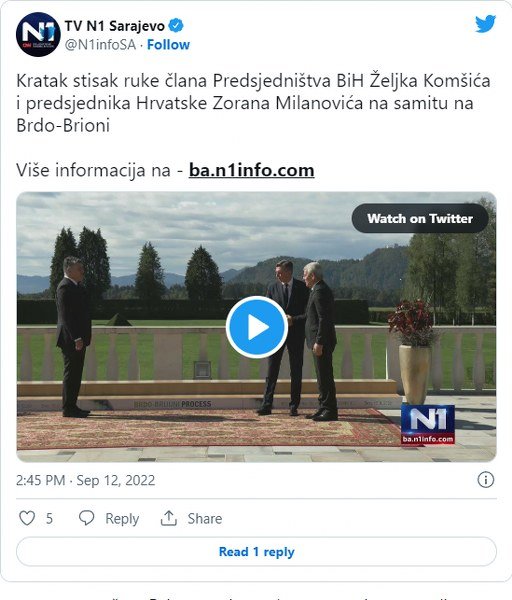 Samit na Brdu-Brijuni završen je bez usvojene deklaracije, ali s pozivom Evropskoj uniji da se Bosni i Hercegovini dodijeli status kandidata do kraja 2022. godine. Objavljen je i snimak dočeka članova Predsjedništva BiH. Njih su dočekali predsjednik Slovenija Borut Pahor te predsjednik Hrvatske Zoran Milanović. Dok se Pahor srdačno pozdravio sa svima, Milanović je zagrlio samo Milorada Dodika.