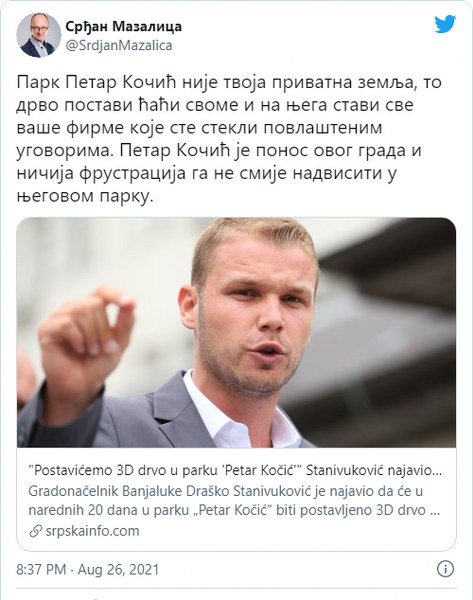 Mazalica je na svom Tviter nalogu napisao da park “Petar Kočić” nije Stanivukovićeva privatna zemlja.