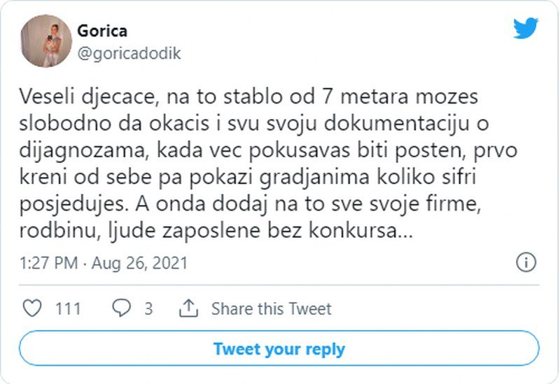 – Kada već pokušavaš biti pošten, prvo kreni od sebe pa pokaži građanima koliko šifri posjeduješ. A onda dodaj na to sve svoje firme, rodbinu, ljude zaposlene bez konkursa – napisala je ona između ostalog na svom Tviter nalogu.