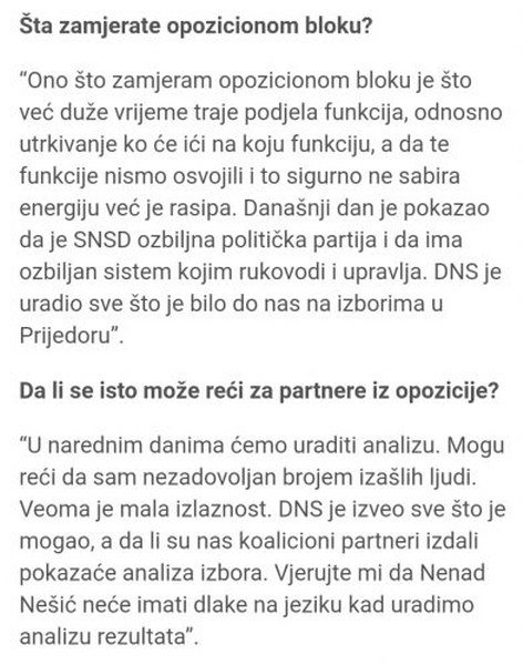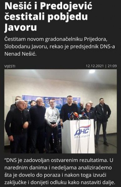 Dr Predojević je dobar čovjek i kandidat, ali je problem što je njegova stranka DNS bila vlast i imala gradonačelnika u Prijedoru skoro dvije decenije, i upravo zbog toga sam predlagao da se kandiduje nestranačka ličnost koja neće na plećima vući hipoteku grešaka svoje stranke iz prošlosti, jer Prijedorčani ne doživljavaju DNS kao promjenu. Najveći uzrok bojkota građana, slabe izlaznosti i rezultata opozicije, po mom skromnom mišljenju, je u činjenici da je na čelu Izbornog štaba i kampanje za Predojevića bio Nenad Nešić, koji nema uporište i podršku naroda.