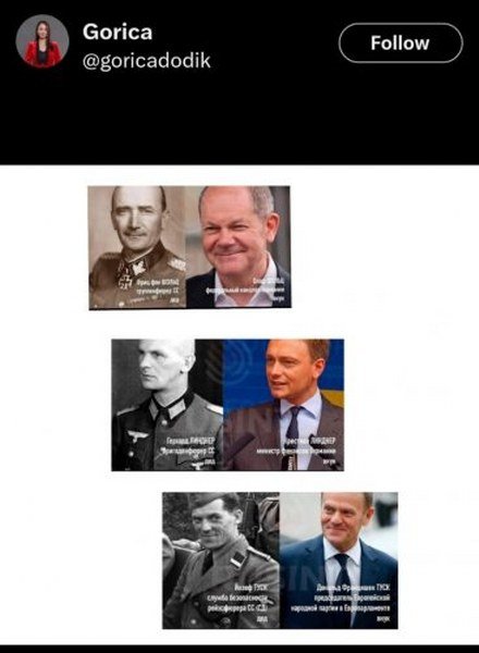 “Gospođa Gorica Dodik je nedavno objavila sliku na “X” gdje je navela da su današnji predstavnici EU potomci Hitlerovih vojnika. To je objavila u petak, a meni ljudi šalju kako gospodin Igor Dodik avionom Vlade Republike Srpske iz Mahovljana isti dan kreće za Njemačku.”