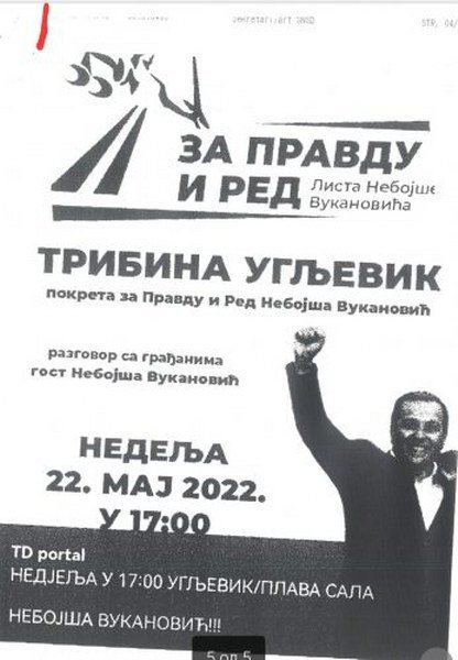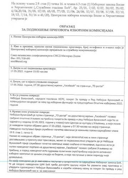 Prigovor SNSD-a od 17.5.2022. godine je neosnovan, i nema nijednog dokaza da smo niti ja, niti Lista za pravdu i red, čiji sam osnivač i predsjednik, prekršili bilo koju odredbu Izbornog zakona BiH. Nisam platio bilo kakvo oglašavanje u medijima, niti organizovao bilo kakvu tribinu „Za pravdu i red – liste Nebojše Vukanovića“ u Ugljeviku. Na svom blogu „nebojšavukanović.info“, koji je jako uticajan i ima skoro 180 000 pratilaca na društvenim mrežama, te YouTube kanalu koji ima više od 72 000 pratilaca, isključivo najavljujem događaje i posjete, oglašavam se u javnosti, i naravno da na mom blogu nema nikakve najave „tribine Za pravdu i red – liste Nebojše Vukanovića“ u Ugljeviku, kako to pokušava lažno predstaviti u svom Prigovoru SNSD, već samo najava internog događaja – otvaranje Kancelarije Liste za pravdu i red u Bijeljini.