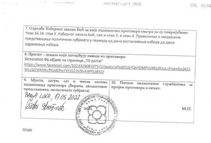 IZJAŠNJENJE NA PRIGOVOR SNSD-a OD 17.5.2022. godine