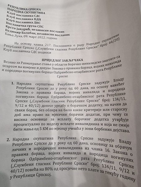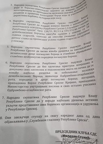 Pročitajte koji su zahtjevi demobilisanih boraca i boračkih udruženja koje su predložili na usvajanje na današnjoj Posebnoj sjednici Narodne skupštine Republike Srpske, a formalno su u njihovo ime zaključke potpisali i podržali poslanici opozicije.