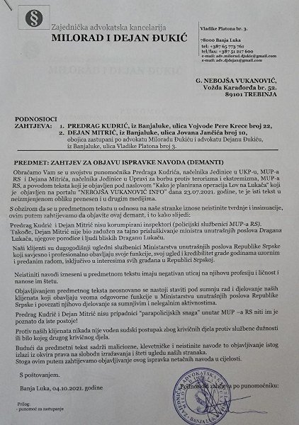 Prenosim u cjelosti Dopis koji sam dobio od advokata Milorada i Dejana Đukića zastupnika dvojice inspektora Policije i Ministarstva unutrašnjih poslova Republike Srpske, koji reaguju na tekst „Kako je planirana operacija Lov na Lukača“ u kome sam govorio o svojim insajderskim informacijama i dešavanja u vrhu MUP-a Srpske.