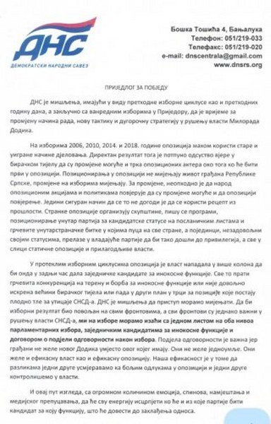 Prekjuče sam na elektronsku poštu dobio Dopis nazvan „Prijedlog za pobjedu“ od DNS-a, koji je potpisao predsjednik ove stranke Nenad Nešić, u kome se predlažu principi daljeg opozicionog djelovanja u 2022. godini. Nešić između ostalog predlaže da opozicija na izborima nastupi sa jednom zajedničkom listom, koja bi trebala po njegovim proračunima osvojiti 35 poslaničkih mandata u Narodnoj skupštini Republike Srpske, te jednu listu za Predstavnički dom Parlamentarne skupštine BiH.
