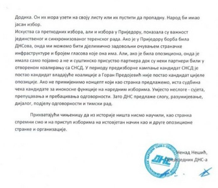 Pored toga Nešić predlaže da mu se obeća mjesto premijera u novoj Vladi, a ako neka opoziciona stranka mimo podrške DNS-a predlaži i kandiduje nekog za predsjednika ili člana Predsjedništva BiH, onda će i DNS istaći svoje kandidate. Ovakav diskurs, ucjene i ultimatumi su nedopustivi i ne može se komunicirati na ovakav način.