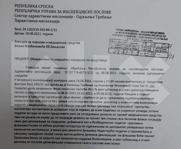 Kako saznaje Klix, u vanrednoj inspekcijskoj kontroli 19. avgusta 2021. godine inspektoru Republičke uprave za inspekcijske poslove - Sektor zdravstvene inspekcije - Odjeljenje Trebinje je predočena faktura kao dokaz da je Bolnica Trebinje od kompanije Milojević Gilje Gas zaprimila tečni kiseonik čistoće 99,5% azot suboksid ii ugljen dioksid.