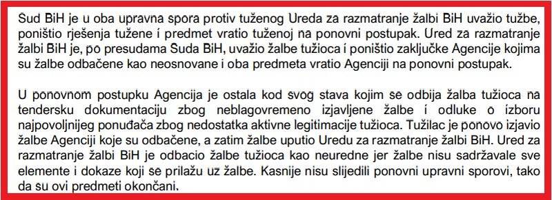 Krajem novembra Sud BiH donio je presudu po tužbi firme Thales DIS France SA protiv Ureda za razmatranje žalbi u kojoj je navedeno da je Ured prekršio Zakon o javnim nabavkama i Zakon o upravnom postupku kada je odbio žalbu ove firme izjavljenu na tendersku dokumentaciju za nabavku pasoških knjižica.