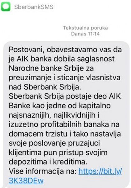 Klijenti Sberbanke u Srbiji dobili su jutos obavještenje da je AIK banka postala vlasnik uz saglasnost Narodne banke Srbije, pa se postavlja pitanje zašto proces preuzimanja banke i promjene vlasništva nije završen u Republici Srpskoj i BiH?