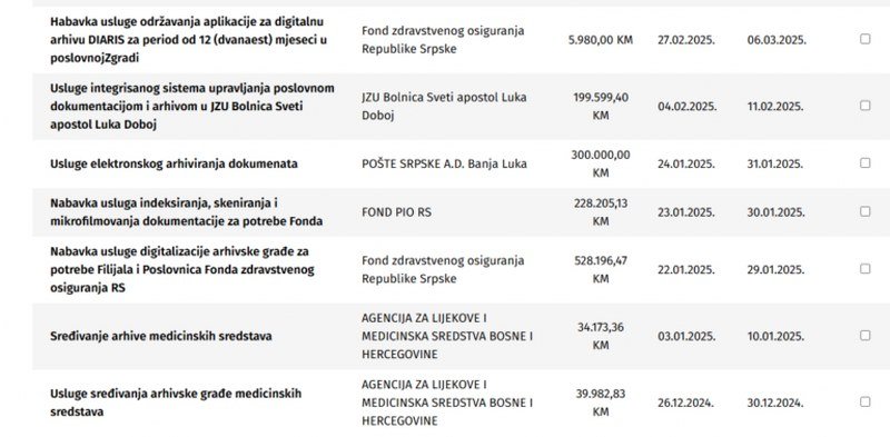Usluge elektronskog arhiviranja dokumenata Pošte Srpske platile su 300.000 KM, dok je za indeksiranje, skeniranje i mikrofilmovanje dokumentacije Fond PIO RS izdvojio 230.000 KM. Za integrisani sistem upravljanja poslovnom dokumentacijom i arhivom u JZU Bolnica Sveti apostol Lukau Doboju dali su 200.000 KM.