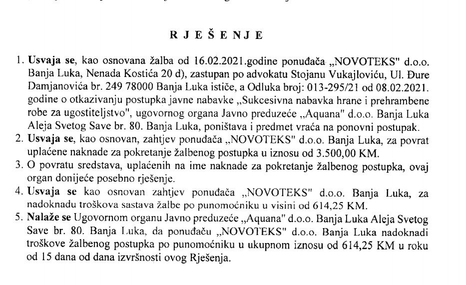 Međutim, u toj namjeri nova uprava „Aquane“ je bez zakonskog osnova donijela Odluku kojom otkazuje nabavku pokrenutu još prošlog ljeta, utvrdila je Kancelarija za razmatranje žalbi (KRŽ) BiH koja je postupala po žalbi firme „Novoteks“. Ta firma je na spornom tenderu dala najpovoljniju ponudu, ali ugovor sa njima „Aquana“ nije zaključila.