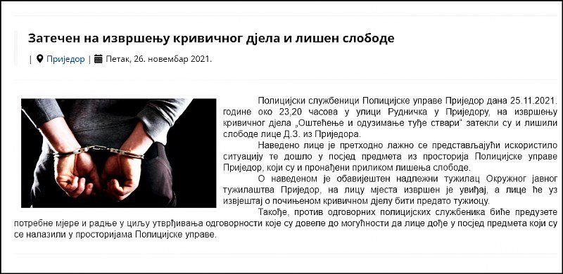 Na gornjoj fotografiji vidite saopštenje policije povodom ovog događaja, a prezentujem ga kao konkretan dokaz zataškavanja. Pogledajte navod: "Navedeno lice je prethodno lažno se predstavljajući iskoristilo situaciju te DOŠLO U POSJED predmeta iz prostorija Policijske uprave Prijedor, koji su pronađeni prilikom lišenja slobode". Prijedorska čaršija prepričava urnebesne detalje ovog događaja, a šta je objektivna istina neka nam kaže ministar kroz dalja vrlo konkretna pitanja,