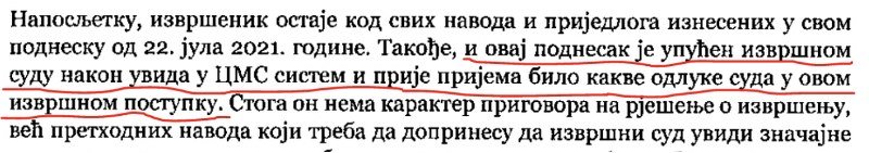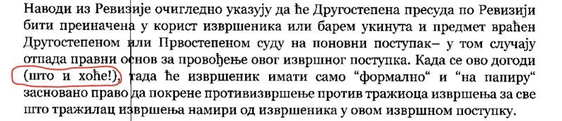 Bilo bi zgodno upitati predsednika Suda Asmira Koričića, da li je mislio na taj slučaj, svedočeći na saslušanju. I tvrdeći da Sud ne snosi krivicu zbog predugog trajanja postupka, već, kako on to svedoči, pravni subjekti snose krivicu. Kako je moguće završiti izvršni postupak na osnovu žalbe?!!