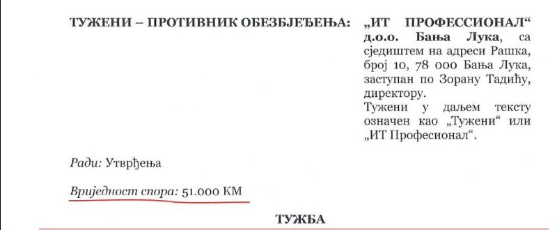 Ne zaustavljaju se “Integra Inženjering” i njihov pravni zastupnik ‚‚master advokat" Dimitrijević u svojoj nameri da, pošto poto, zadrže ukradeno, već preko svojih fiškala podnose tužbu protiv firme “IT Professional” za nepostojeći dug u visini od 51.000 KM.