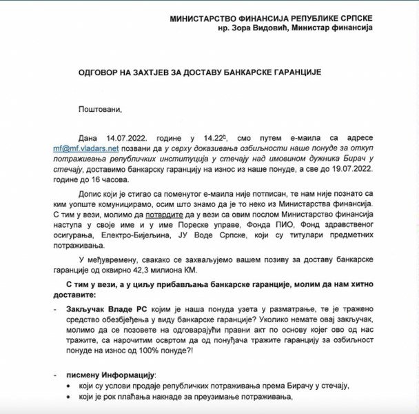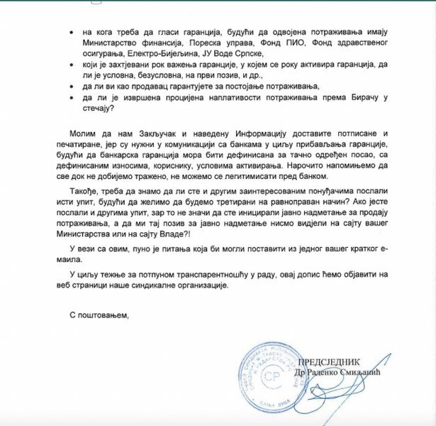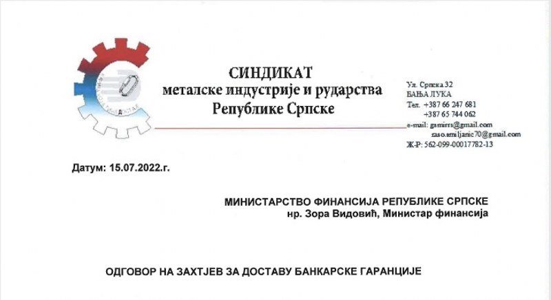 Odgovor radnika Alumine na nepotpisani zahtjev Ministarstva finansija RS za dostavu bankarske garancije (Dok.)