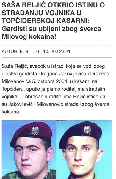 Saša Reljić, svjedok u istrazi koja se vodi zbog ubistva gardista Dragana Jakovljevića i Dražena Milovanovića 5. oktobra 2004. u kasarni na Topčideru, uputio je pismo roditeljima stradalih vojnika. U obraćanju roditeljima Reljić ističe da su Jakovljević i Milovanović stradali zbog šverca kokaina. Opisujući odgovornog za smrt dvojice mladića, Reljić je citirao nedavnu izjavu šefa DPS Mila Đukanovića, koji je poručio da će izgubljenu vlast u Crnoj Gori braniti i iz šume. Reljić je time otkrio koga smatra odgovornim za ubistvo gardista.