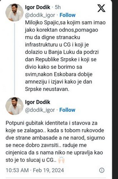 Da režim u Republici Srpskoj rovari u cijelom regionu, ima sumnjive poslove i operacije potvrđuje i nevjerovatno priznanje novog organizacionog sekretara i prvog operativca SNSD-a Igora Dodika, koji je javno napao crnogorskog premijera Milojka Spaića. Igor je napisao da je pomagao Spaiću da „digne stranačku infrastrukturu“ a sada mu zabija nož u leđa jer sluša Eskobara i Amerikance. Čudno jer je Dodik uporno tvrdio da Andrija Mandić i DF imaju njegovu podršku, da prati politiku Vučića i SNS-a, ali očigledno da se iza kulisa igra na više opcija.