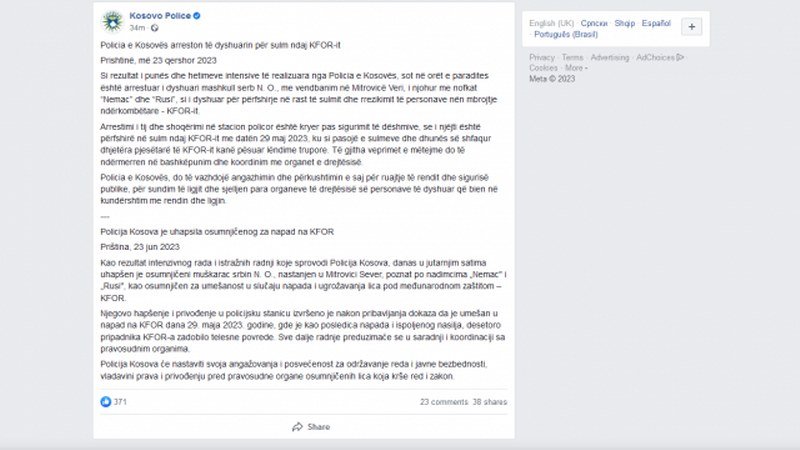 "Kao rezultat rada i intenzivnih istraga koje je sprovela Kosovska policija, osumnjičeni srpski muškarac N.O. uhapšen je danas u prepodnevnim časovima. Poznatiji po nadimcima Nemačka i Rusija, osumnjičen je za umešanost u slučaj napada i ugrožavanja međunarodno zaštićenih lica - Kfora. Njegovo hapšenje i izvršeno je nakon što su sakupljeni dokazi, da je isti bio uključen u napad na Kfor 29. maja 2023. godine, gde je kao posledica napada i nasilja, desetine pripadnika Kfora zadobilo telesne povrede. Sve daljnje akcije bit će poduzete u suradnji i koordinaciji s pravosudnim organima", navodi se između ostalog u saopštenju.