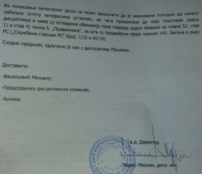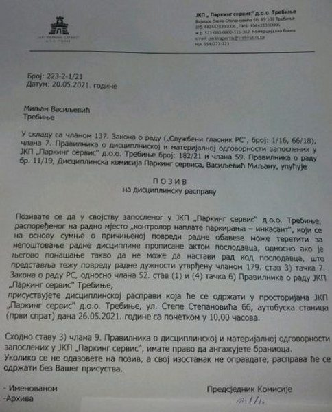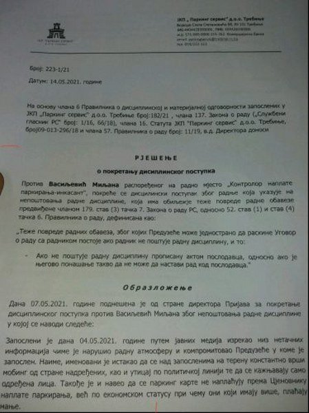 Vasiljević je nakon javnog istupa na BN televiziji, ukazivanja na zloupotrebe i nezakonite radnje u radu Parking servisa i gradske administracije, dobio Disciplinsku prijavu i prijetnje otkaza Ugovora o radu. Očigledno da je direktor Parking servisa Marko Miskin dobio zadatak od gradonačelnika Mirka Ćurića, koji je otvoreno prijetio Vasiljeviću da će dobiti otkaz i biti kažnjen jer govori istinu, da ućutka i ostavi bez posla radnika koji se ne plaši govoriti istinu i da tako pošalje jasnu mafijašku poruku svim ostalim kako će proći ako odluče da javno progovore i ukažu na kriminal.