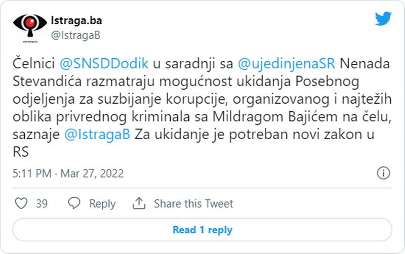 Lider SNSD-a Milorad Dodik u saradnji sa Nenadom Stevandićem iz Ujedinjene Srpske razmatraju mogućnost ukidanja Posebnog odjeljenja za suzbijanje korupcije, organizovanog i najtežih oblika privrednog kriminala sa Mildragom Bajićem na čelu.