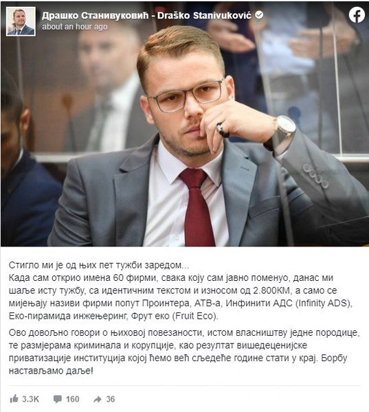 "Kada sam otkrio imena 60 kompanija, svaka koju sam javno spomenuo, danas mi šalje istu tužbu", napisao je Draško Stanivuković.