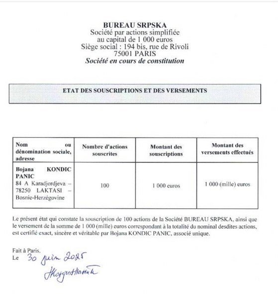 Međutim, Republika Srpska se nigdje ne pominje kao osnivač Biroa Srpske u Francuskoj. Prema dokumentaciji francuskih vlasti, Bojana Kondić-Panić 3. juna 2025. godine predala je zahtjev za osnivanje preduzeća u Parizu koje ima status sličan bh – “društvu ograničene odgovornosti”. Kondić-Panić je taj zahtjev poslala u periodu dok je još obavljala funkciju ambasadorice BiH u Parizu, što je suprotno svim propisima koji reguliraju status diplomatskog osoblja. Osnivački kapital preduzeća koje se zove “Bereau Srpska” bio je 1000 eura. Vidljivo je to i iz dokumenta u prilogu.