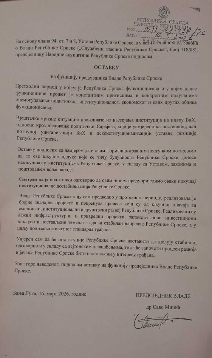 U dokumentu datiranom 16. marta 2026. godine u Banjaluci, Minić navodi da ostavku podnosi na osnovu odredbi Ustava Republike Srpske i Zakona o Vladi Republike Srpske.