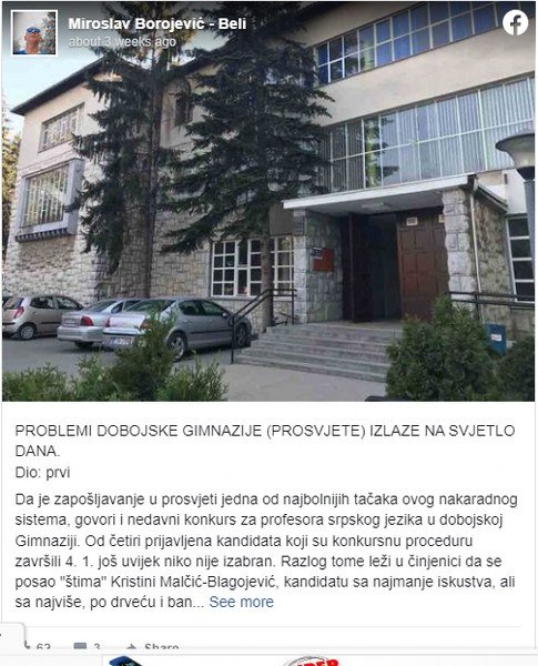 Miroslav Borojević Beli, koji će, kako ‘’Moja Hercegovina’’ nezvanično saznaje, na predstojećim izborima djelovati kroz pokret ‘’Za pravdu i red’’, nedavno je na svom FB profilu iznio saznanja vezana za konkurs za profesora srpskog jezika u dobojskoj Gimnaziji ‘’Jovan Dučić’’. Prema njegovim saznanjima, iako je konkursna procedura završena 4.1. tekuće godine, nijedan od četiri kandidata još uvijek nije izabran ua upražnjeno mjesto. Kao razloge za to Borojević navodi da se posao namješta Kristini Malčić – Blagojević, aktivistkinji vladajuće stranke u Doboju.