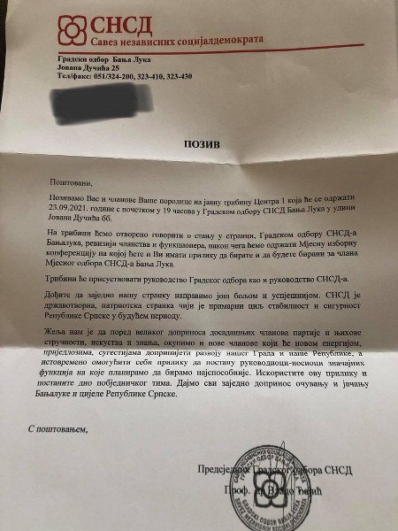 Mnogi Banjalučani proteklih dana na adresu dobili su poziv na javnu tribinu koja je planirana danas kod OŠ Branko Ćopić. Kako je najavljeno na tribini će se govoriti o stanju u stranci, Gradskom odboru SNSD-a, a uslijediće i revizija članstva i funkcionera. Tribini će prisustvovati rukovodstvo Gradskog odbora kao i rukovodstvo SNSD-a. Ništa ne bi bilo neobično u svemu ovome da poziv nisu dobile osobe koje nikad nisu bili članovi SNSD-a, ali i osobe koje ne žive na adresama gdje je poziv stigao.